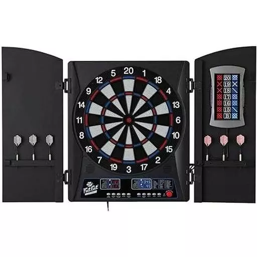 Become a virtuoso of darts with the Fat Cat Mercury Electronic Dartboard. This electronic dartboard and cabinet hybrid features a compact 13.5” target area with target tested tough segments, a large missed catch ring, and storage space for 12 darts. The Fat Cat Mercury has 28 dart games, including 01 and cricket, and over 150 scoring options so you can play how you want to. With up to 8 player multiplayer, everyone can join in on the fun, especially since the built-in handicap feature will make sure everyone has a fair shot at victory. The backlit LCD display automatically keeps score and even displays your Point Per Dart (PPD) and Marks Per Round (MPR) averages for 01 and Cricket after the game. This is all built-in to a sleek cabinet that will easily blend into your decor. This electronic dart board set comes with six starter soft tip darts and is powered by the included AC adapter.