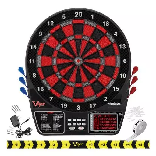 The Viper 797 electronic dartboard features a 4 person cricket LCD display that is very easy to read from the throw line. The illuminated display features pub style cricket scoring and lights up red. This regulation sized 15 1/2-inch accommodates up to 16 players, 43 games, and over 241 options. Includes AC Adapter. Front mounting for easy hanging.