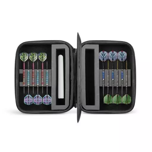 The tough supersized 23x18 cm Mega Tactical Dart Case carries and protects four sets of fully assembled darts without crushing flights, ready for play. But that’s just the start. A quality zip closure opens the case like a clamshell. The dual-sided inner sleeve with multiple storage compartments provides generous storage for flights, shafts, and accessories. Use the full-depth zipped pocket for secure phone storage on one side; a large pocket on the other is useful for personal items like cards and keys. The portable Mega Tactical case has a quality nylon handle and metal d ring for clipping on extras-whatever you need for the competition.