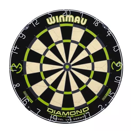Geared for the modern game at the most advanced level, this refined triangular wire MvG Diamond Plus gives you dramatically improved durability and playability featuring Winmau’s high tensile Dynamic Sector Wiring. Made to World Darts Federation standards, this tournament approved dartboard is finished with hi-visibility scoring zones and anti-glare number ring for world class performance.