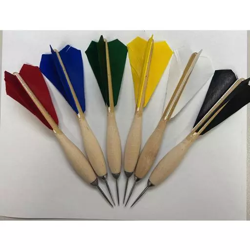 Handcrafted wood darts with genuine turkey feather flights.