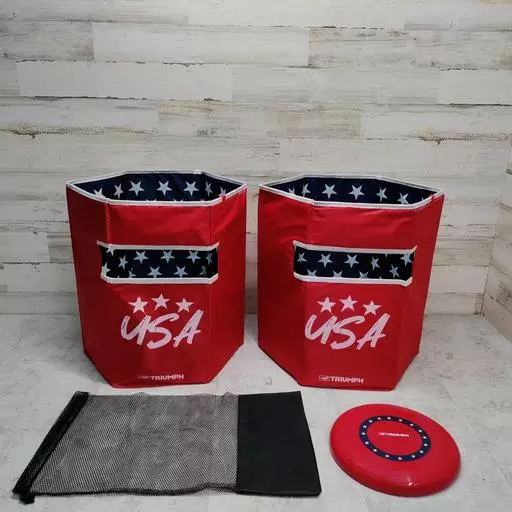 Bring the excitement of disc flyerz – with a twist – to your own backyard this summer! The object of our Patriotic Disc Flyerz game is to throw your disc toward the opposite hexagonal can – if it goes through the slot in the front, you will receive 3 points. If the disc goes in at the top, that's 1 point. The first player to score 21 points wins. Everything you need to get started is included: Collapsible cans with an easy-to-read slide scoring system (screen-printed on the sides), one plastic flying disc and a convenient storage bag. Fast-paced play makes this outdoor activity a winner for competitive players.
